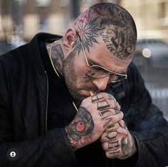 Side view of tranquil male with tattooed bald head standing with closed eyes in nature against river and mountain in cloudy day — person, people - Stock Photo | #467857560