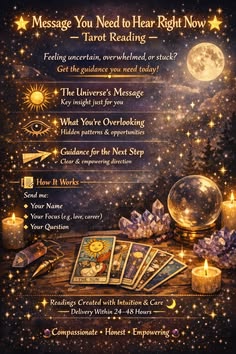 🌟✨ Message You Need to Hear Right Now - Tarot Reading Feeling uncertain, overwhelmed, or stuck? This quick, intuitive tarot reading delivers the message the universe wants you to hear right now -- the insight you may be overlooking and the guidance you need for your next step. 🌟 What You Receive: ✨ The Universe's Message The key insight or lesson meant specifically for you at this moment. ✨ What You're Overlooking Hidden patterns, opportunities, or advice that may not be obvious. ✨ Guidance...