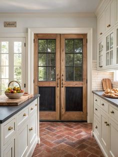 a kitchen with white cabinets and black counter tops next to a wooden door that has glass panes on it