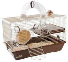 I drilled 2.5" holes between all the sections, and added PVC tubing to protect to wood from nibbly hamsters. The top section had no ventilation, so I made the front surface out of hardware cloth. The bottom two floors (and an inch of the top) is clear plexiglass.