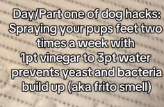 an open book with the words day / part one of dog hacks spraying your pups feet two times a week