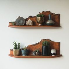 This kitchen makeover features painted cabinets and open shelving made with live-edge floating shelves. Includes hardware recommendations for the shelves.