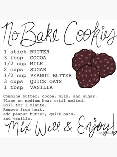 a recipe for no bake cookies is shown in black ink on a white background