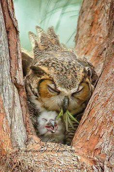 an owl and its baby are in a tree together, with the mother feeding it