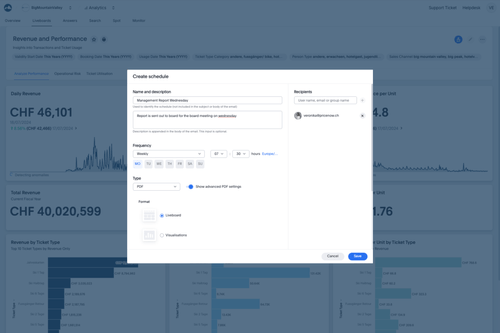 Müssen Sie regelmässig Berichte manuell erstellen und versenden? Mit unserer Data Analytics Lösung planen und erstellen Sie Berichte automatisch, um Ihre Stakeholder effizient und aktuell mit den wichtigsten KPIs zu versorgen. Sparen Sie Zeit und gewährleisten Sie stets aktuelle Informationen.