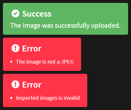 Was the upload successful? A green "Success" message means the image was successfully uploaded. A red "Error" message means the image was rejected because it didn't meet at least one of the conditions.