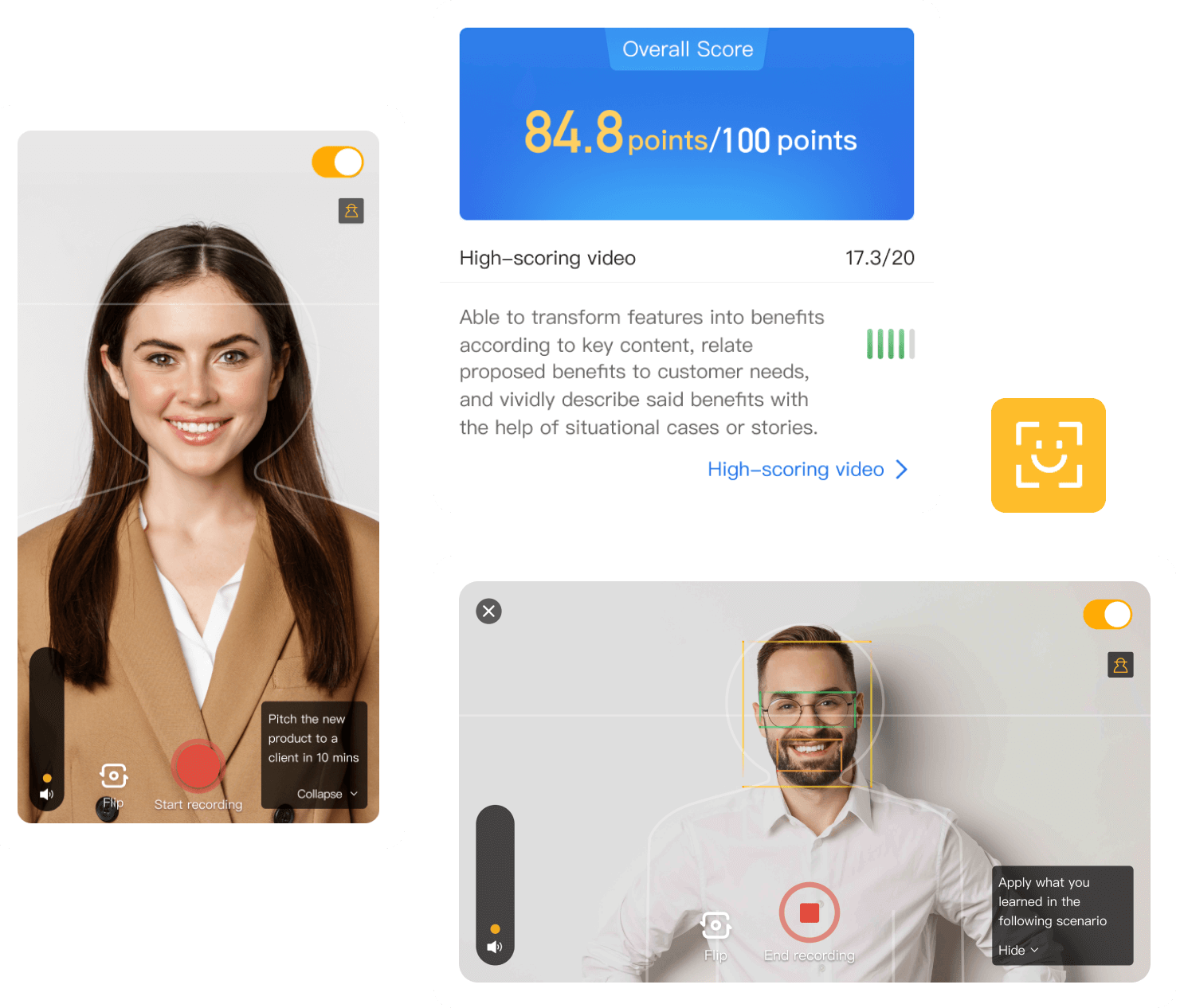 Leverage our AI-powered coaching tool to help sales teams practice at scale and deliver stellar presentations on product knowledge, FABs, and more in line with your industry’s best practices