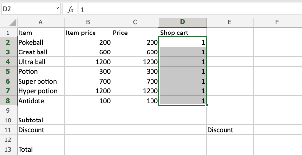 Start by creating the first formula for Item price*Shop cart. We want the price to change when we change items in the Shop cart. Use the fill function on the range D2:D8 afterwards to save time.