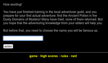 This is an entry to roguetemple's Fortnight. This is not a roguelike, it lacks what made Rogue different from text adventures. It is more of a pastiche of the rules of the jam, according to which NetHack and other roguelikes I started which are not "traditional roguelikes". (See the in-game "rant" for more.)