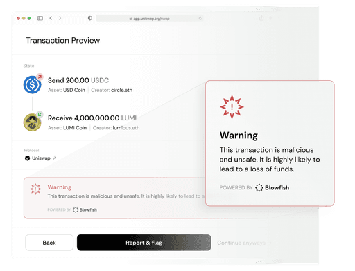 • Blowfish simplifies transaction messages and provides a secure signature process, alerting our wallet users of malicious dApps!