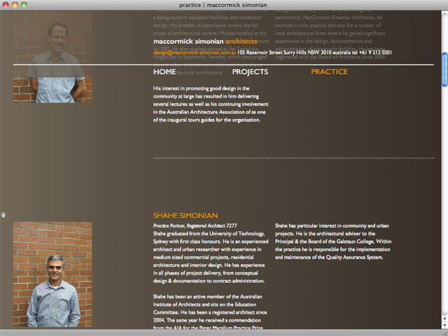 MacCormick Simoninan Architects 2010 website An architect’s website. Our design for this Sydney practice is rich with photo imagery – the interface ‘keeps you on the page’ even as you view categories in detail. all development Textpattern CMS ongoing support Made in Korokoro