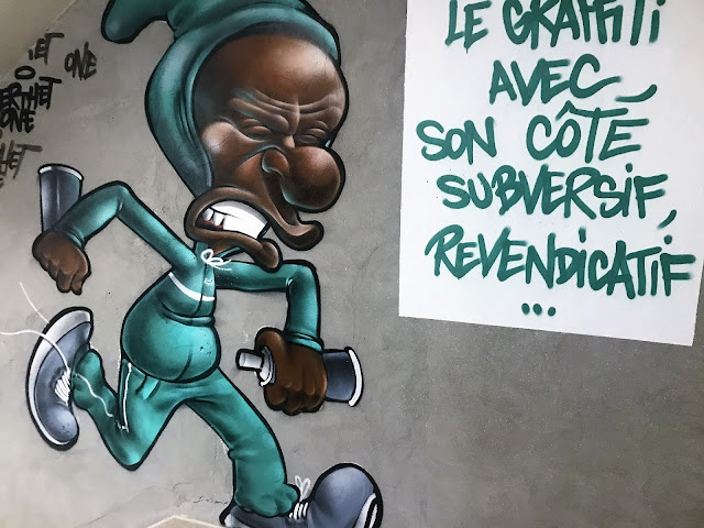 Pour conclure ce deuxième chapitre de la visite, je retiens un thème récurrent et cher à beaucoup de street artistes : combien il est difficile dans le milieu du graffiti de concilier l'art de galerie, la notoriété et les éléments matériels de la vie d'artiste (faire du pognon pour manger) et l'aspect vandal, illégal, sans autre objectif de créer dans la plus totale liberté. Deux artistes ont voulu aborder cette thématique. Berthet insiste frontalement sur cette dichotomie, entre l'institution et la marginalité. Il était situé dans un escalier qui montait au premier étage.