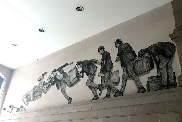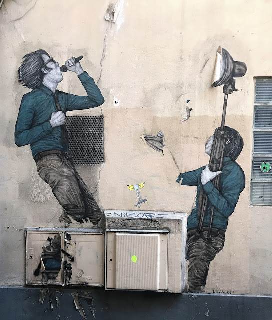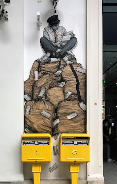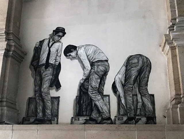 Dans le cadre d'un projet avec la SNCF Gares & Connexions et la maison de prod Quai36, Levalet a embelli quelques coins de la gare Saint Lazare. La photo de tête d'article (au dessus des boites aux lettres de la Poste) est issue aussi de ce projet à St Lazare.