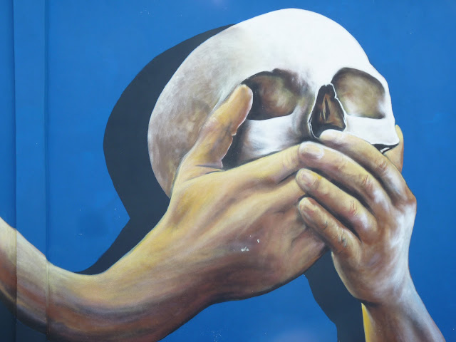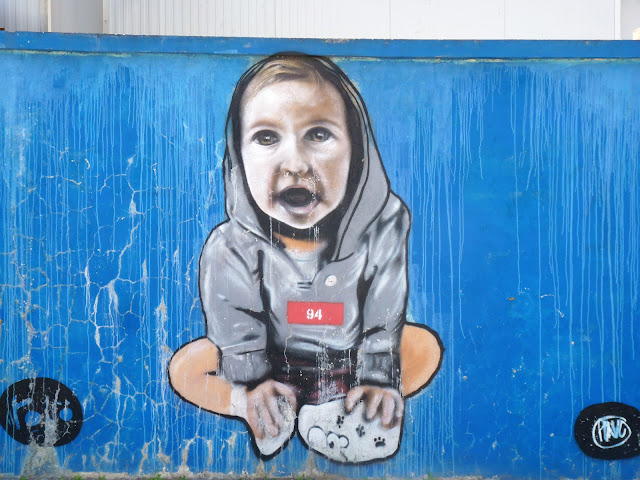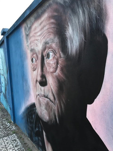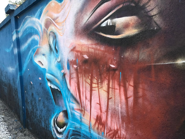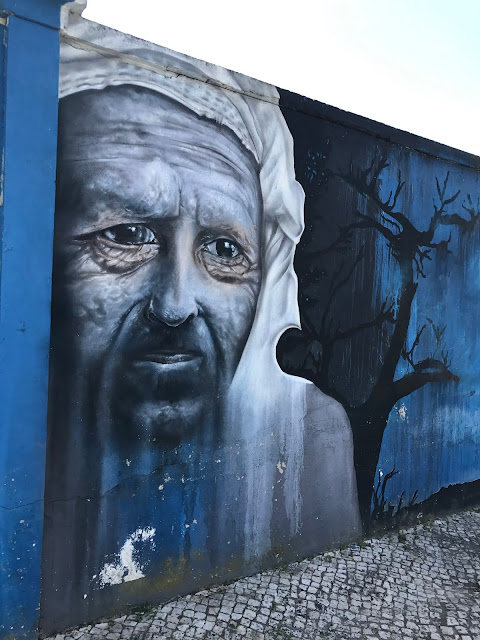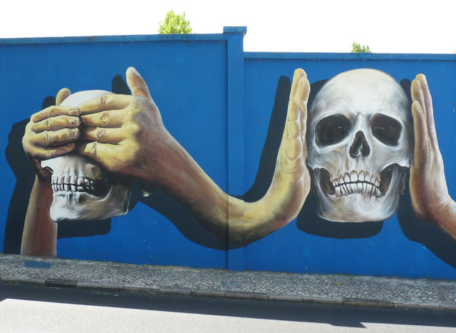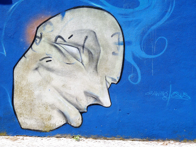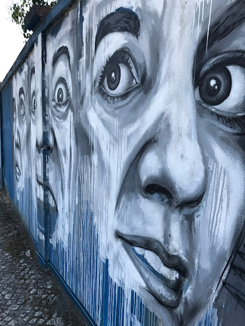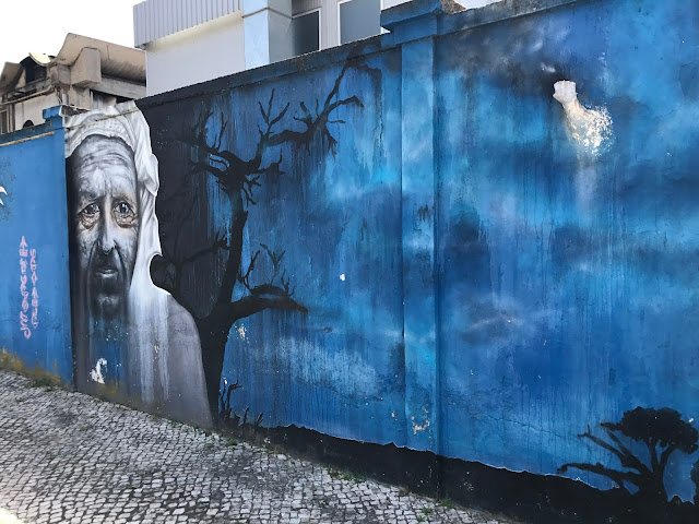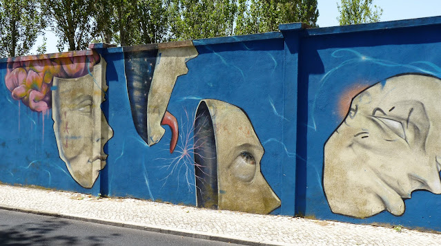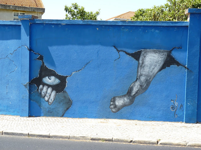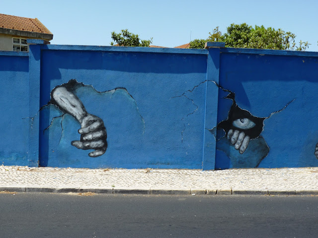 Parmi les spots à ne pas manquer la Rua das Murtas n'est pas souvent évoquée, à mon grand étonnement. Dans le quartier d'Alvalade, près du stade de foot du Sporting, une rue très longue fait le tour d'un hôpital psychiatrique. Ce mur essentiellement tourné vers le bleu est long d'un ou deux kilomètres.