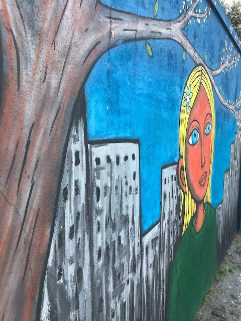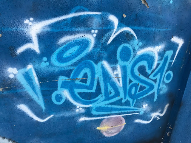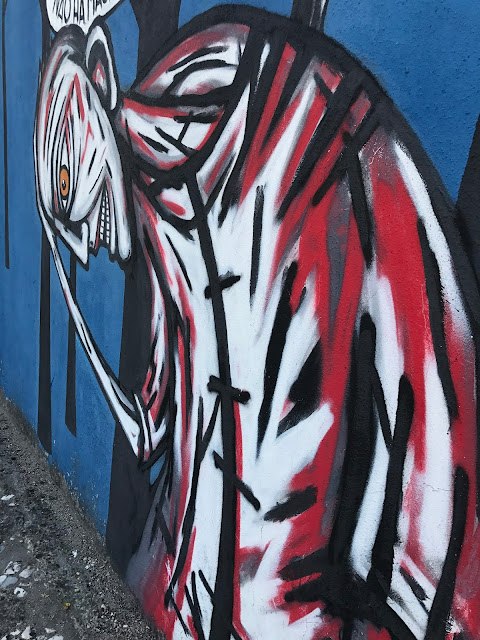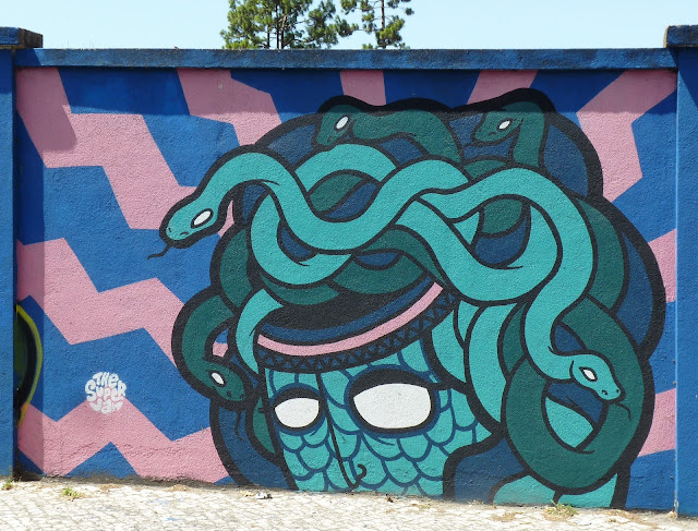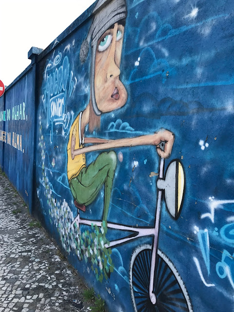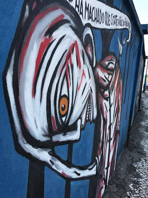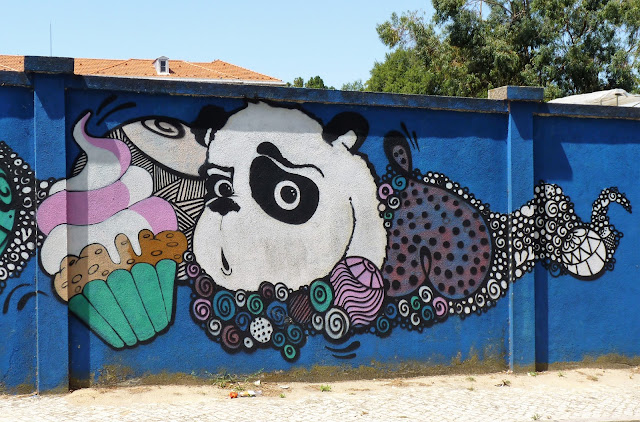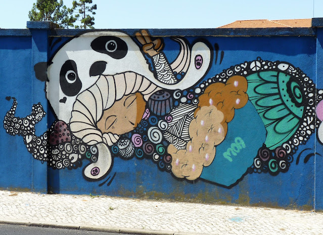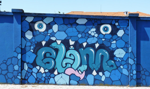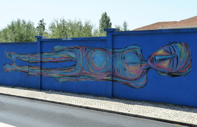 Parmi les spots à ne pas manquer la Rua das Murtas n'est pas souvent évoquée, à mon grand étonnement. Dans le quartier d'Alvalade, près du stade de foot du Sporting, une rue très longue fait le tour d'un hopital psychiatrique. Ce mur essentiellement tourné vers le bleu est long d'un ou deux kilomètres.