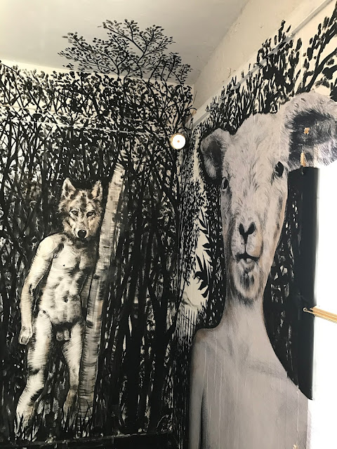 Ca valait le coup de faire la queue dans le froid et dans le vent, on entre dans la vieille bâtisse et sur la gauche, on débouche dans une première salle. Celle-ci est décorée par Ganaëlle Maury. Le style du dessin est simple mais efficace, tout en détails, en finesse, les couleurs sont douces. L'ensemble ravit l'œil immédiatement.