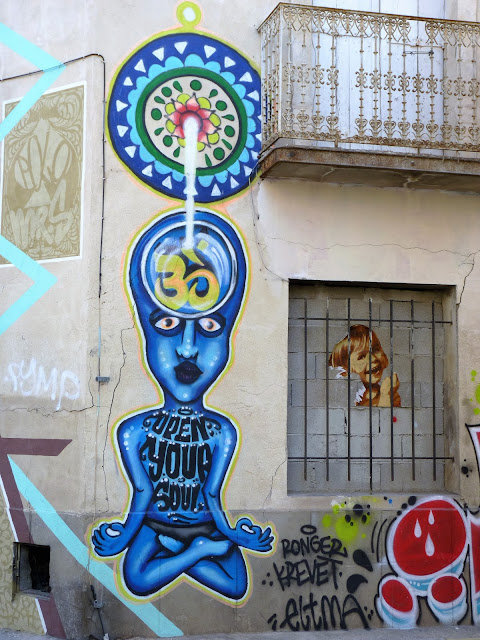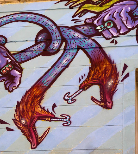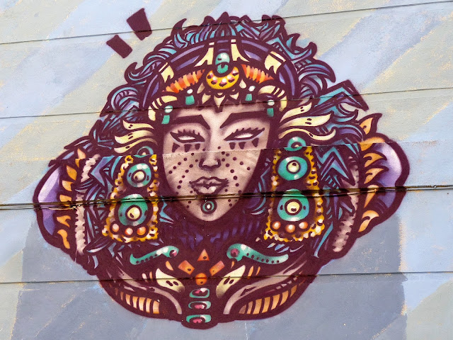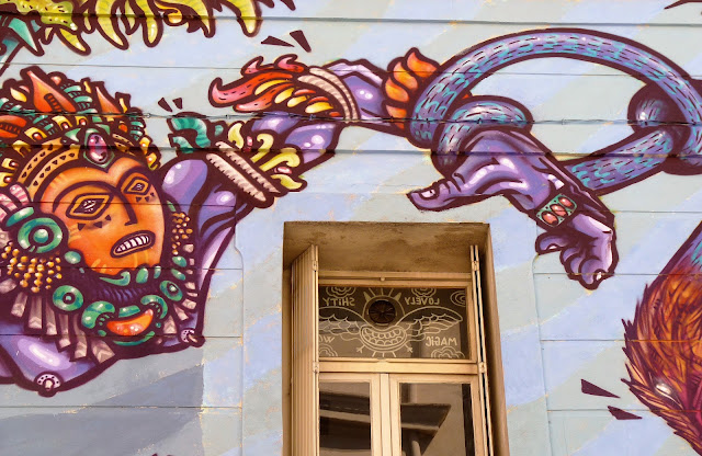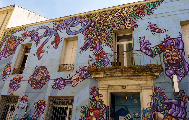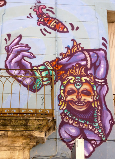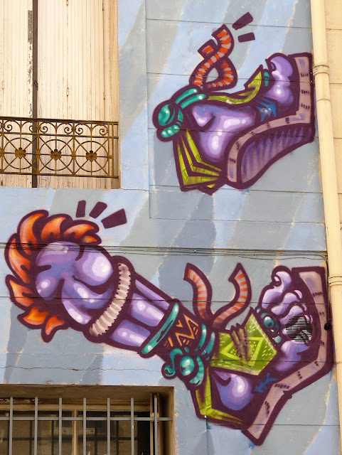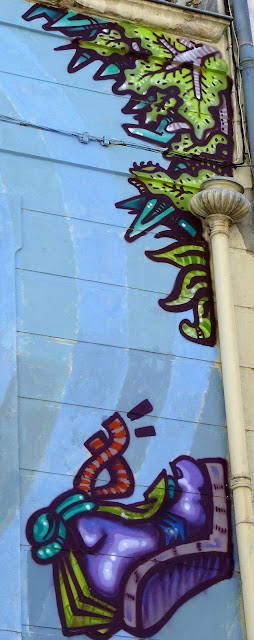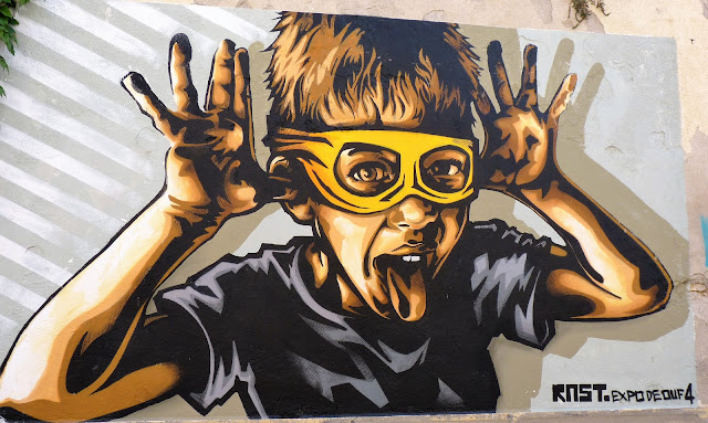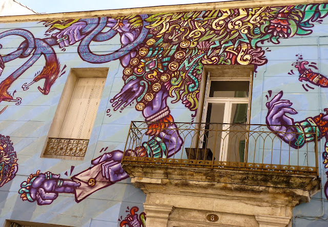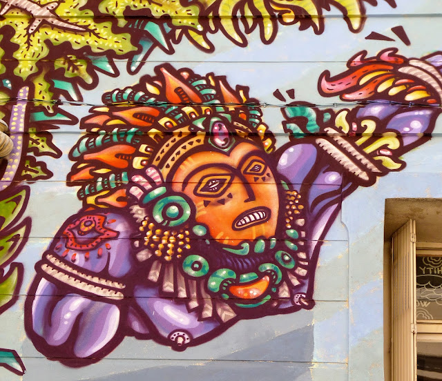 En ce mois de septembre 2016, la façade du Spot à Nimes est recouverte par l'artiste Spone, Rue de l'enclos Rey. Dans un style à la fois très bédé mais aussi très précolombien, le mur s'agite et prend vie. Protéiforme et multicolore. Comme on les aime.