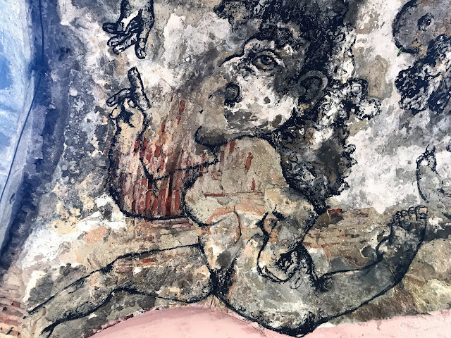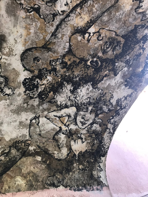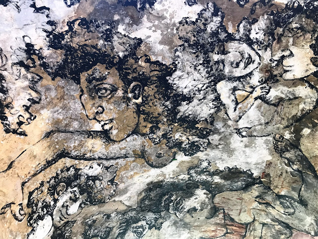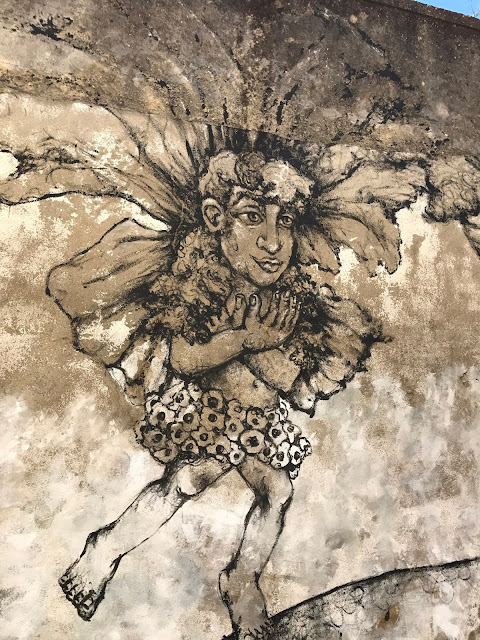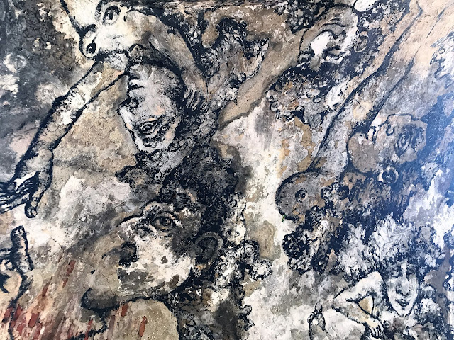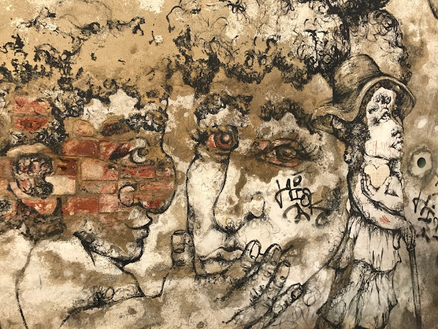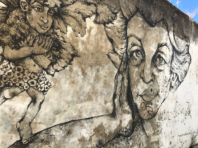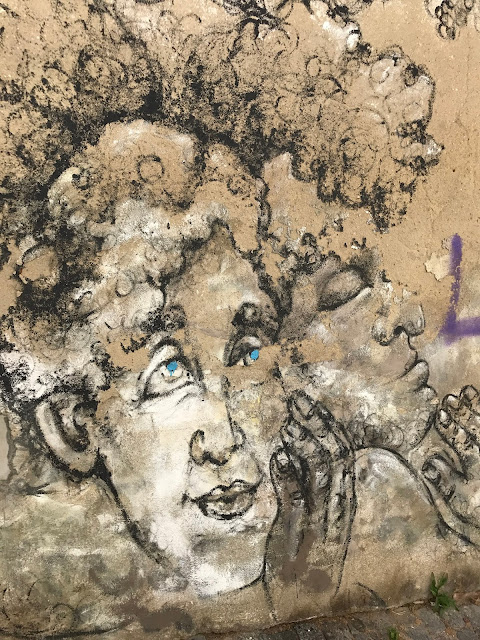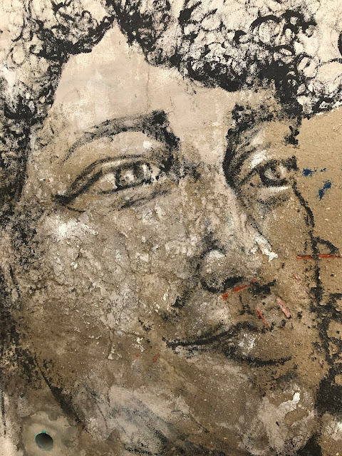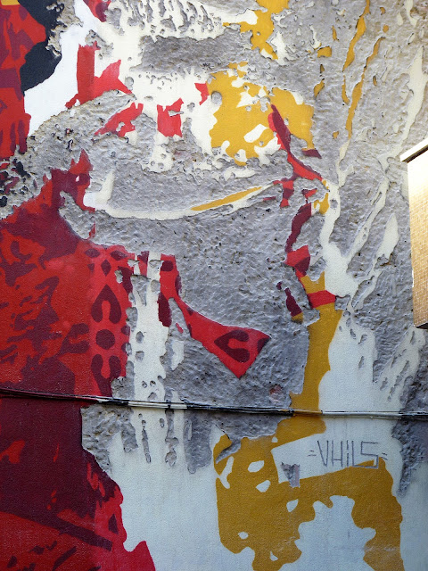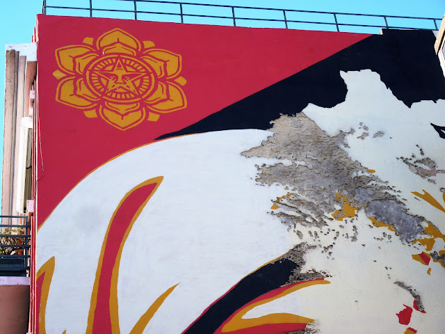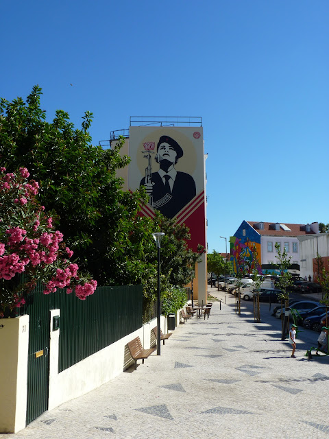 A quelques rues de là, dans la Rua da Senhora da Gloria, Shepard Fairey s'associe avec le régional de l'étape, le lisboète Vhils pour une œuvre maitresse époustouflante. J'en garde un souvenir hyper ému. A couper le souffle! J'adore le style très pop culturel, à la graphie commerciale, un peu bédé de Shepard Fairey. Celui de Vhils est d'un autre ordre, presque magique, un tour de passe passe en ombre et lumière, jouant du relief légèrement creusé dans la pierre ou l'espèce de stuc qui recouvre les immeubles. Et chose extraordinaire : les deux styles entrent en symbiose ici, de façon aussi naturelle qu'inattendue.