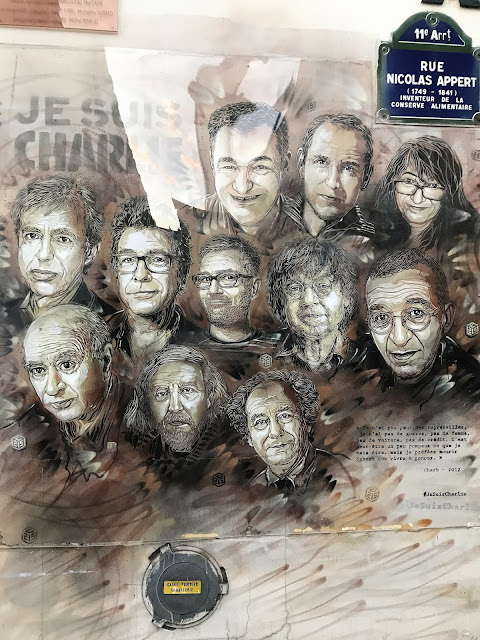 La thématique est plus violente Rue Nicolas Appert avec l'hommage aux membres décédés et survivants de Charlie Hebdo.