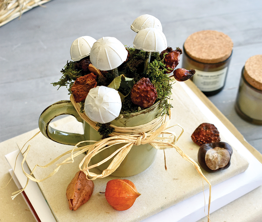 A gipszet bekeverjük vízzel és a formákba öntjük, ágakat szúrunk a közepükbe, majd száradás után csak kinyomkodjuk őket a formából. A bögrét vagy tálat esetleg konzerves dobozt, kinek mi tetszik, megtöltjük virágfölddel, beszúrjuk a gombákat és kedvünk szerint díszijük, termésekkel, mohával, szalaggal.