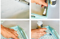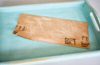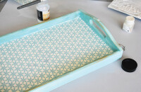 A tálcát picit átcsiszoljuk, ahol szeretnénk befedni szalvétával (ha az oldala szép, maradhat eredeti állapotában is.) Fehér akrilfestékkel fessük le a szalvéta helyét, hogy a régi minta ne üssön át. Száradás után bekenjük ragasztóval, és a rétegekre szedett szalvéta színes oldalát ráfektetjük (folpack darabkával bevont ujjal könnyen kisimítható), majd száradás újra lekenjük.