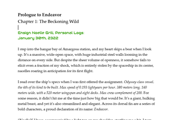 Prologue to Endeavor is a series of short written works that take place during the years preceding the advent of Planet of Ash, my upcoming visual novel. Set from 2322 to 2324, they follow the crew of the exploratory space vessel Endeavor as it ventures into an uncharted region of the cosmos.