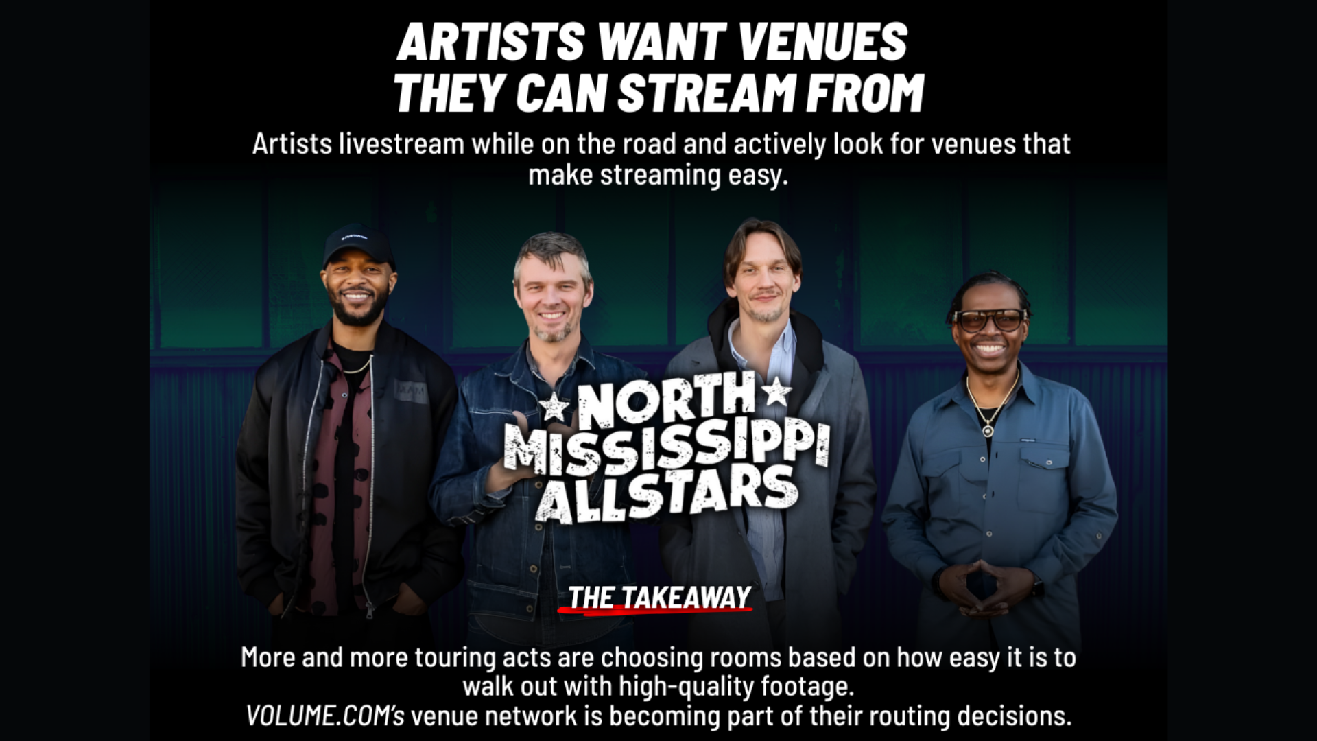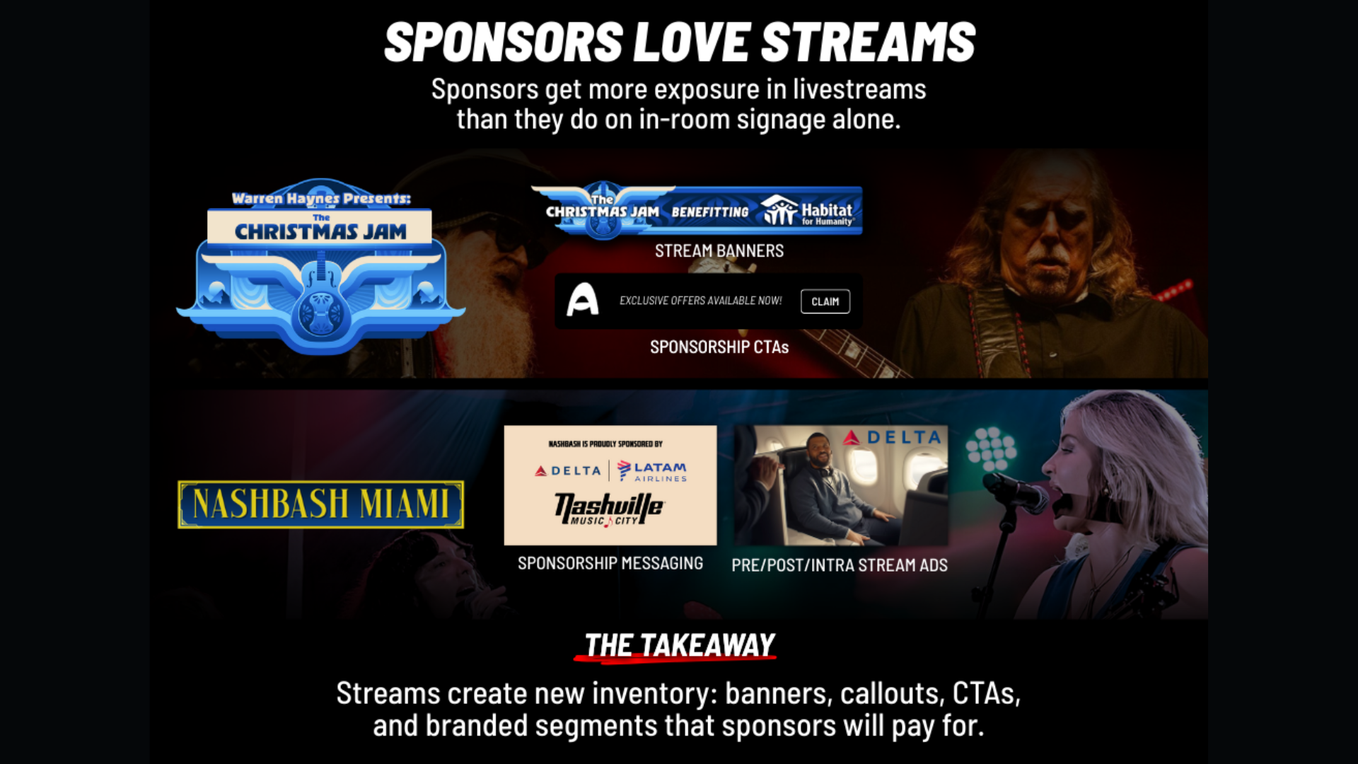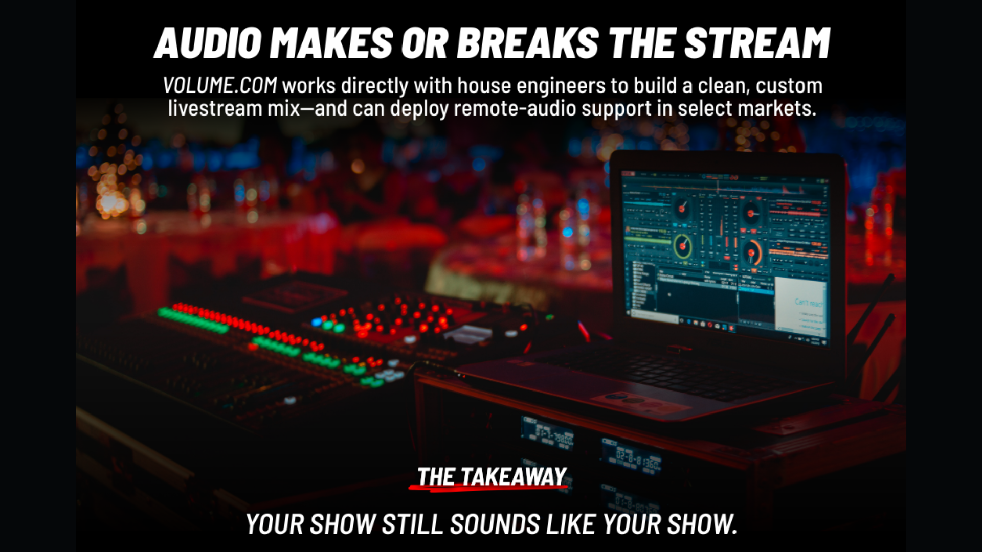 Livestreaming through Volume.com gives venue owners sponsorship inventory that: Reaches audiences beyond capacity, is measurable and reportable and lives on after the show ends.