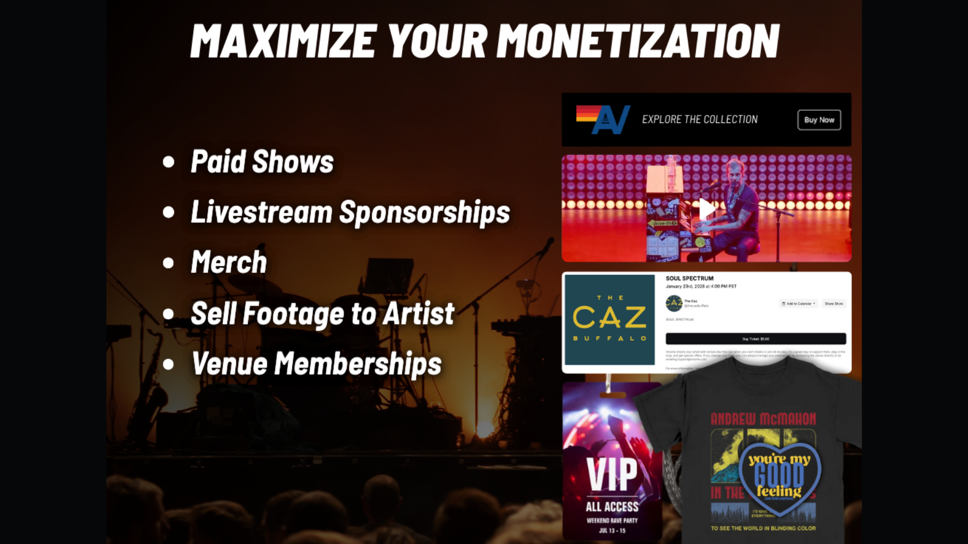 Some shows aren’t about maximizing revenue. They’re about showing up for the community. Livestreaming allows venues to extend benefit concerts, fundraisers, and special events to supporters who can’t be in the room — without limiting participation by geography or capacity.