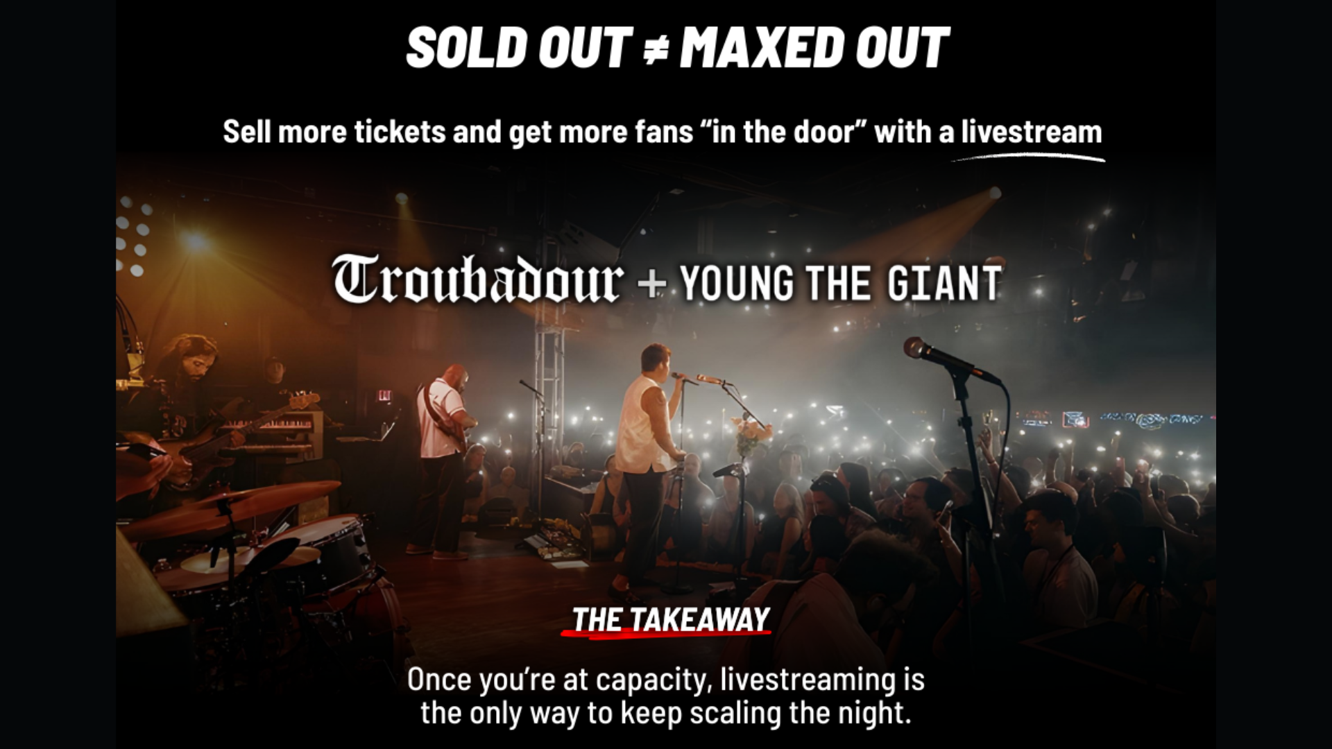 Venues like The Troubadour used Volume.com so they wouldn't leave that demand on the table. They livestreamed the sold-out Young the Giant shows as part of their normal operations, turning two strong nights into something that continues to generate value.
