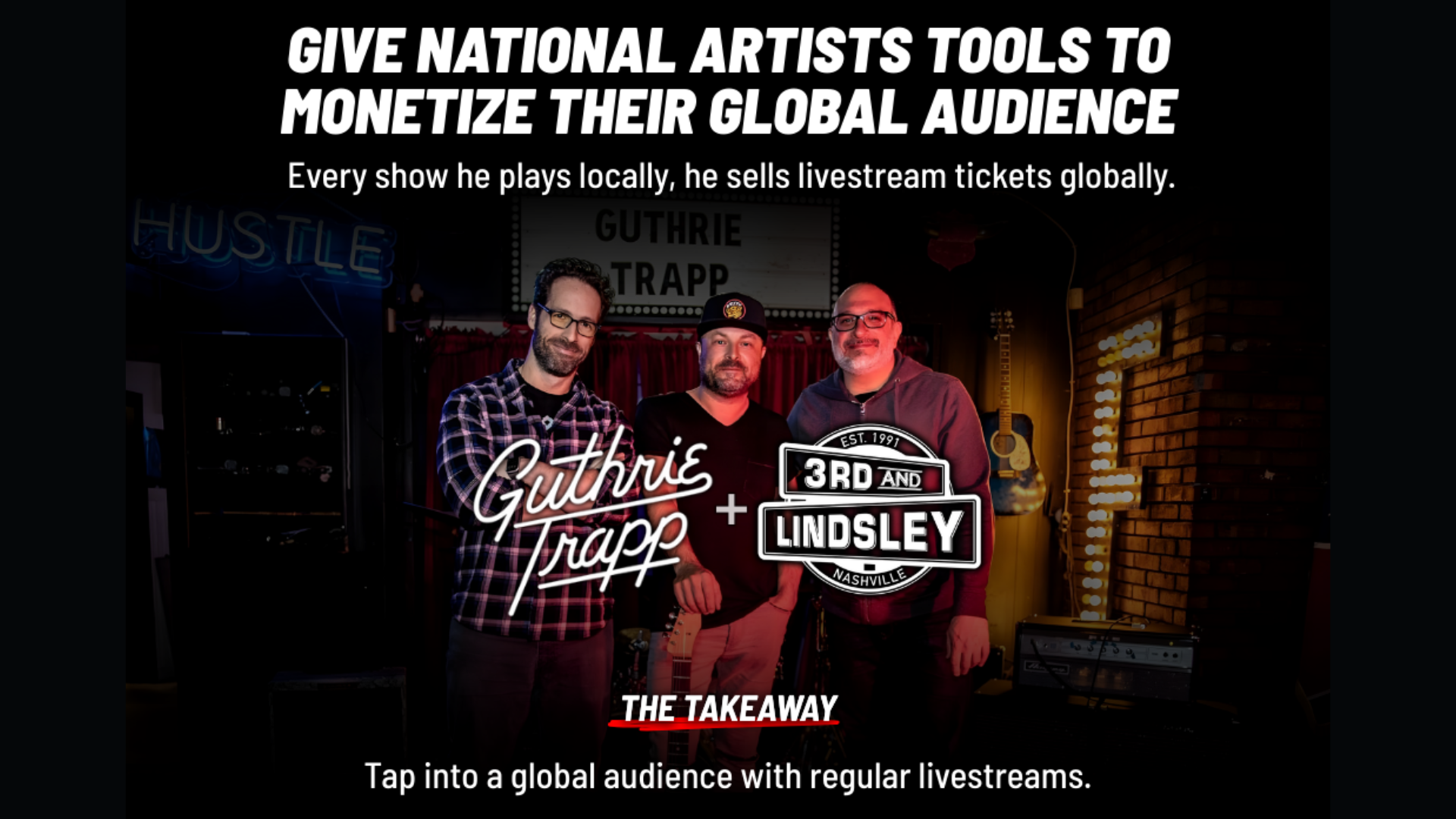 Artists like Guthrie Trapp lean on Volume.com to livestream local shows to his global audience, solving the problem of fans who can’t attend without asking the artists to do more work.