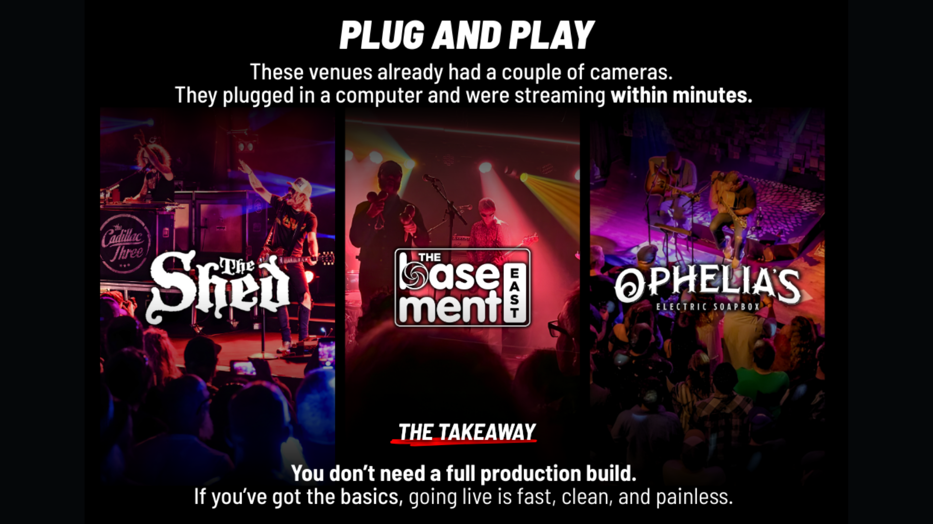 Livestreaming only feels complicated when it isn’t designed for venues. That’s why venues like The Shed, Basement East, and Ophelia’s have been able to plug in and stream without changing how they run shows.