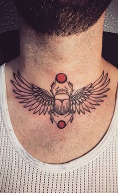 a man's neck with a scarp and wings tattoo on the top of his chest