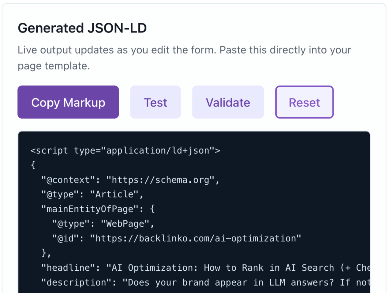 Type into the form and watch your JSON-LD update live. No coding, no formatting, no extra steps.