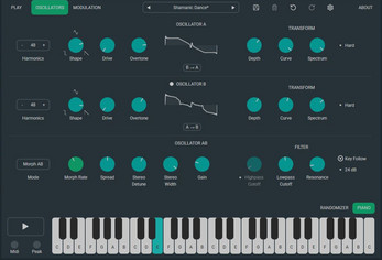 Dual oscillators generate complex waveforms with overtones, saturation, and morphing.