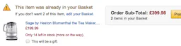 Amazon detects that the product is already in the user’s cart and displays a notice stating that the quantity is now two, but providing a direct link to “edit your Basket” in case the user only wanted one.