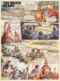 As fans of Ian Kennedy's art we have both been aware of a half page of painted Kennedy comic strip which the Book Palace have had for sale for quite some time now. They describe it as “A fantastic comic page from the 1980s depicting Roman soldiers attacking a fort. From the series 'The Wolves of Gaul'.” This rather suggests that they do not know where it came from. They weren’t the only ones.