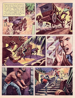 The text in the speech balloons is all too often perfunctory and many panels are silent. Indeed the script has an annoying habit of describing almost an entire page's plotline in one long text panel and then leaving the next half dozen panels of artwork virtually silent as the visual story struggles to catches up with the text. This tends to suggest that the uncredited writer who adapted the story from the original text novel was not a regular comic strip author and while some story elements are dwelt on others are all too often rushed which adds to an overall feeling of unevenness. Dickpa is Biggles’ nickname for his uncle in the original novel but the comic strip version neglects to mention this rather important family connection leaving readers wondering why Biggles trusts this strangely named man so implicitly. Perhaps issues like this were part of the reason that there was no published follow up. In fact the UK had to wait until 1978 for the next Biggles graphic novels which were translations of several Swedish books by Bjorn Karlstrom.