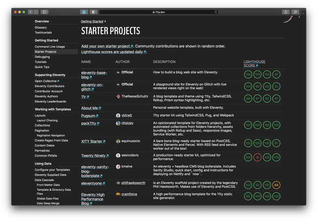 }Eleventy does have a list of starters created mostly by the community. Cool thing is that you can see the Lighthouse scores of each started, updated daily.