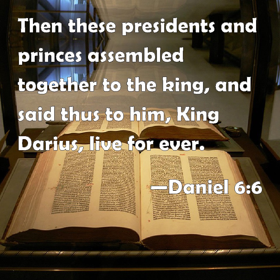 Choose a Background Daniel 6:6 Then these presidents and princes assembled together to the king, and said thus to him, King Darius, live for ever. KJV: Then these presidents and princes assembled together to the king, and said thus unto him, King Darius, live for ever. DRB: Then the princes, and the governors craftily suggested to the king, and spoke thus unto him: King Darius, live for ever: DBT: Then these presidents and satraps came in a body to the king, and said thus unto him: King Darius, live for ever! ERV: Then these presidents and satraps assembled together to the king, and said thus unto him, King Darius, live for ever. WBT: Then these presidents and princes assembled to the king, and said thus to him, King Darius, live for ever. WEB: Then these presidents and satraps assembled together to the king, and said thus to him, King Darius, live forever. YLT: Then these presidents and satraps have assembled near the king, and thus they are saying to him: 'O king Darius, to the ages live!Links Daniel 6:6 NIV • Daniel 6:6 NLT • Daniel 6:6 ESV • Daniel 6:6 NASB • Daniel 6:6 KJV • Daniel 6:6 Interlinear • Daniel 6:6 Commentaries • Daniel 6:6 Parallel Texts • Daniel 6:6 Bible Apps • Daniel 6:6 Parallel • Bible Hub |