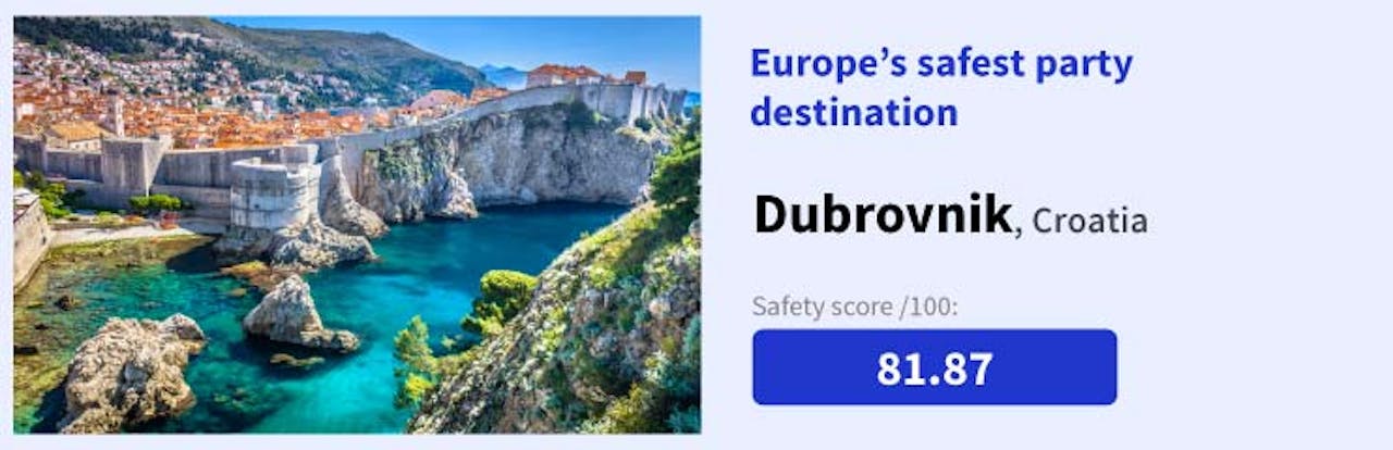 Although it may not be the first thing that comes to mind when you think of partying, it is important to be in a safe environment as you let your hair down. With a score of 81.87 out of a possible 100, Dubrovnik comes out on top as the safest European party destination on our list. The Croatian city has significantly low crime rates which provides a comfortable environment for people looking to party here.