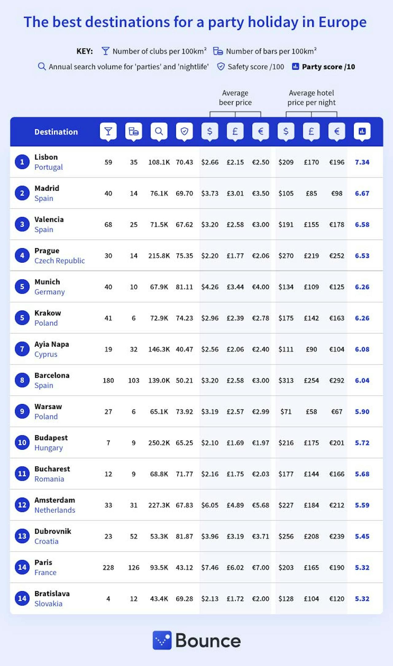 To create the ultimate ‘party score’ we have ranked popular European holiday destinations on a range of party-related factors, including their number of clubs, bars, beer prices, hotel affordability, and safety scores.