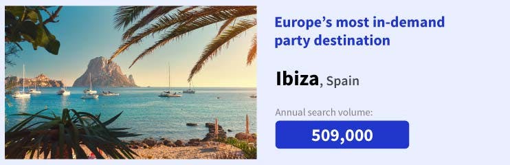 It may come as no surprise that Ibiza has the most party-inspired Google searches of all the European party destinations in this list. Known for its tremendous electronic dance scene, this island is a haven for young people wanting to party. This is evident by the 348,000 total searches for ‘Ibiza parties’ and 161,000 ‘Ibiza nightlife’ searches over the last year.