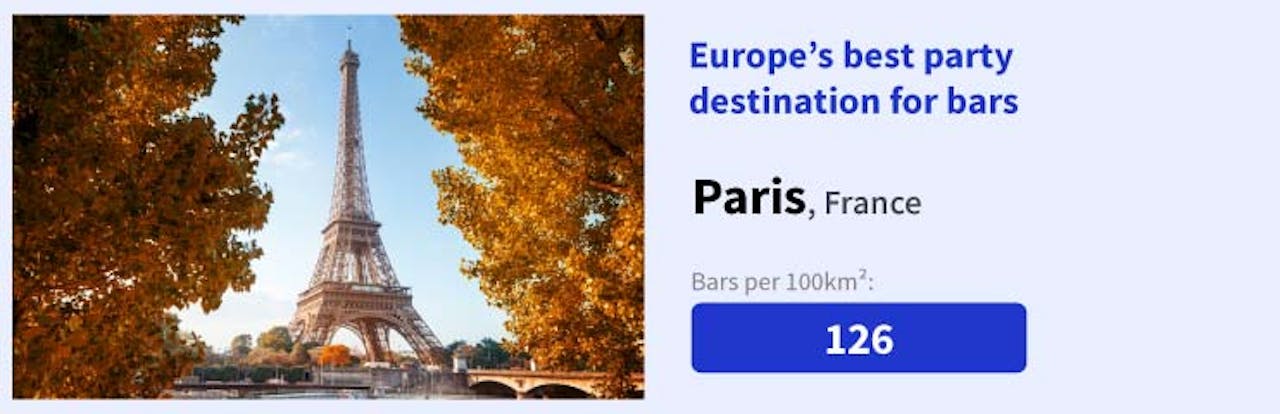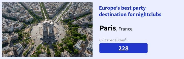 Bars and clubs often go hand-in-hand, with both of them being important when it comes to having a fun night out. With 126 bars per 100km², Paris takes the top spot.