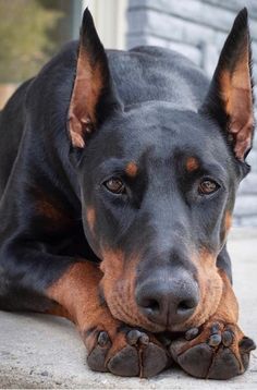 a large black and brown dog laying on top of a cement floor next to a building