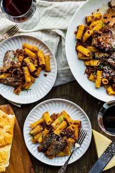 three plates with pasta and meat on them next to some bread, wine glasses and utensils