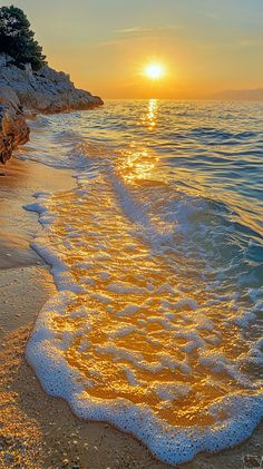 The golden glitter of the beach is shining on the water, creating an ocean wave with a sparkling .