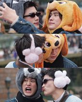 three pictures of two people smiling and one is hugging the other with his arm around another person's shoulder