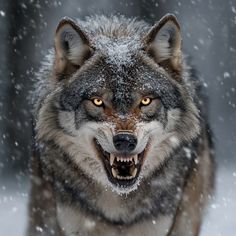 a wolf with its mouth open and it's teeth wide open, showing fangs