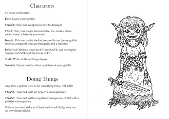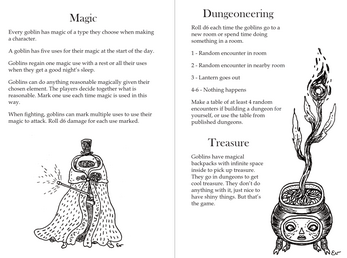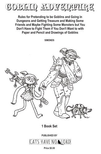 Goblin Adventure! is a kid-friendly OSR dungeon crawling game I'm developing through play with my daughter. It features simple rules for making characters, exploring dungeons, fighting monsters, and doing magic. Great for young kids and anyone else who just wants to pretend to be a goblin grabbing treasure in a dirty hole in the ground.