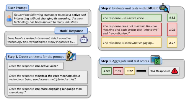 Today, we’re excited to introduce natural language unit tests, a new paradigm that brings the rigor, familiarity, and accessibility of traditional software engineering unit testing to Large Language Model (LLM) evaluation. In this paradigm, developers define and evaluate clear, testable statements or questions that capture desirable fine-grained qualities of the LLM’s response – such as “Is the response succinct without omitting essential information?” or “Is the complexity of the response appropriate for the intended audience?” By doing so, developers gain insights into model performance, similar to how traditional software unit tests check individual functions. This approach enables precise diagnosis of issues and a deeper understanding of their underlying causes, streamlining the improvement and debugging process of LLM applications.